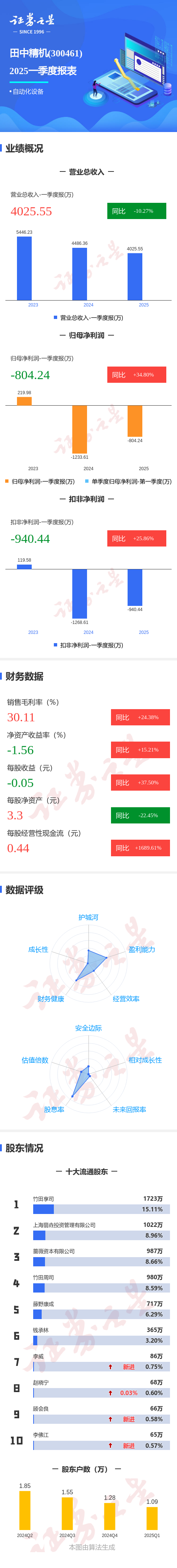 证券之星消息,田中精机2025年一季报显示,公司主营收入4025.55万元,同比下降10.27%;归母净利润-804.24万元,同比上升34.81%;扣非净利润-940.44万元,同比上升25.87%;负债率42.18%,投资收益-817.33万元,财务费用73.49万元,毛利率30.11%。